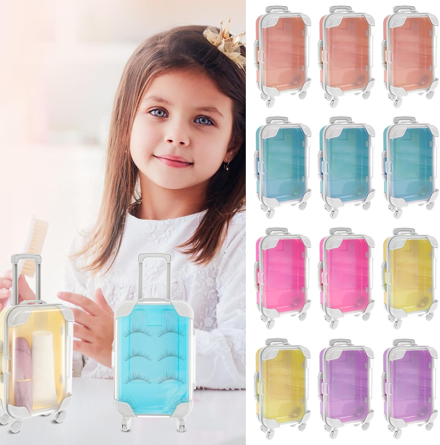 Description:This mini suitcase storage box adopts a unique suitcase shape, which is cute and attractive. It is designed to store candies, chocolates, makeup eyelashes, etc. It uses a transparent lid design, which makes it easy to see the items stored inside, and it looks like a real suitcase.Features:Interesting and AttractiveIt features a telescopic handle, simulated buckle, and rotatable rollers for smooth rolling, looks like a real suitcase, and brings you endless fun.Transparent DesignThe mini luggage storage box adopts a transparent design, so you can intuitively see what is stored inside.Multi ColorOur mini empty luggage box comes with 5 different colors, and rich color making it full of fun. Widely UsesOur mini candy box is suitable for storing candies, chocolates, rubber bands, bracelets and other items, and has a wide range of usesSpecification:Product Name: Mini Suitcase Storage BoxMaterial: ABSSize: 13 × 7.5 × 3.5 cm/ 5.12 × 2.95 × 1.38 inchColor: Pink, Blue, Purple Red, Yellow, PurpleParts List:3×Pink Mini Suitcase Storage Box3×Blue Mini Suitcase Storage Box2×Rose Red Mini Suitcase Storage Box2×Yellow Mini Suitcase Storage Box2×Purple Mini Suitcase Storage BoxNotes:1.There may be slight differences between the picture and the actual color of the commodity. We will try our best to show you the exact color.2.Please allow slight dimension difference due to manual measurement.