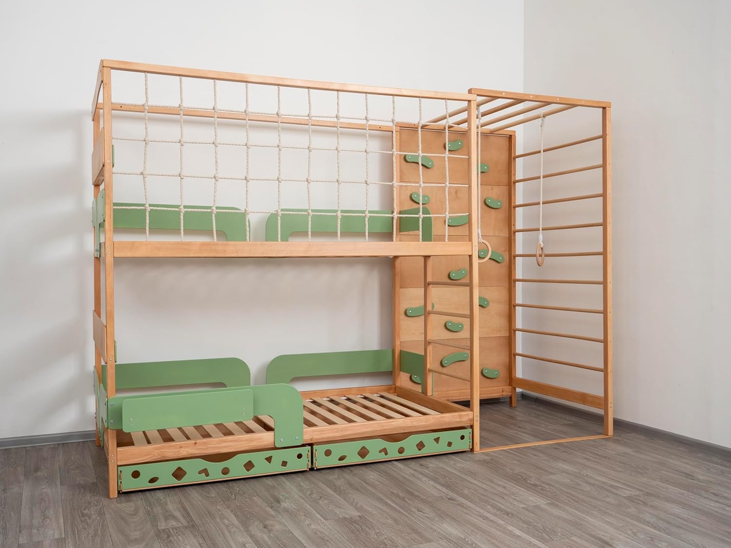 Transform your child's bedroom into a thrilling jungle oasis with our Monkey Jungle Bed – the ultimate fun for young explorers!Designed with imagination and safety in mind, this Montessori-style wood floor bed frame sparks creativity while ensuring a secure sleep environment. Perfect for one or two sleepers, it offers both comfort and excitement. With its integrated play area featuring stimulating climbing elements, every bedtime becomes an adventure.The twin toddler floor bed is made of high-quality Alder wood, and the climbing elements are crafted from beech wood and cotton rope. Decorative panels are made of birch plywood.For painting, we use water-based paints and varnish.All parts of the product are hand-polished. The color of the product may slightly differ from the photo and can be lighter or darker due to the natural wood.**Secure Anchoring Required:**Anchoring your Jungle Bed to the wall keeps it securely in place, reducing the likelihood of it falling during play or exploration.**Bed Size (depends on mattress size):**- Twin size: 75 x 38 inches**2 Drawers:**Depth: 18.5 x Width: 37 in x Height: 5.5 in.The maximum weight capacity for the sleeping place is 264.6 lbs (120 kg). The weight capacity for the climbing panels is 220 lbs (100 kg).We recommend using a mattress with a thickness of 7.9 inches (20 cm).- Watch your little one during active play on the bed frame. - Sold disassembled, assembly required (tools included).- One handyman is recommended for assembly. A screwdriver can be used, but be careful not to overtighten the screws. Assembly may take 2-4 hours.- 2-year warranty included.