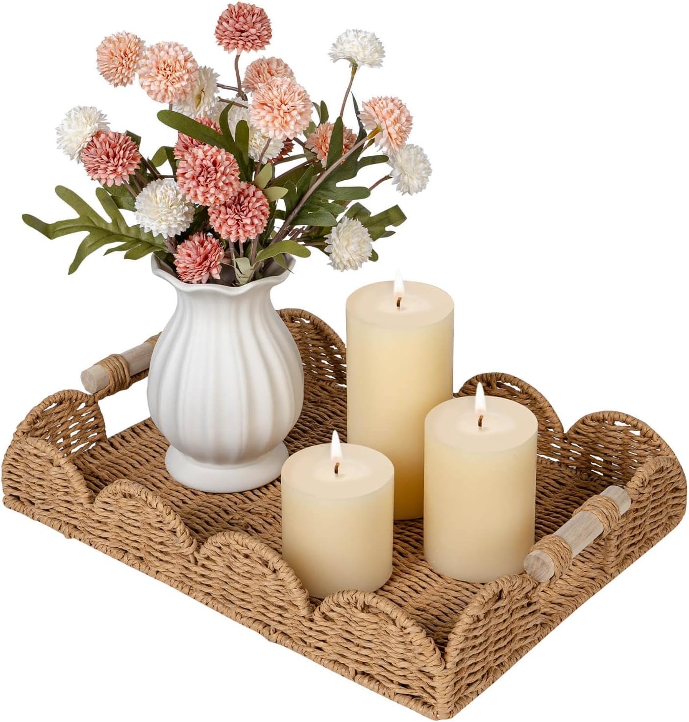 CubesLand Scalloped Edge Coffee Table, Ottoman Serving Tray Basket Rectangle, for Living Room, Home Decor, Also Perfect for Easter, Halloween, Fall, Christmas Decorative, with Wood Handles