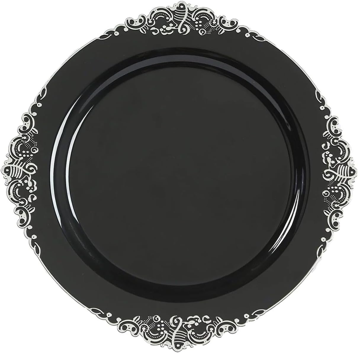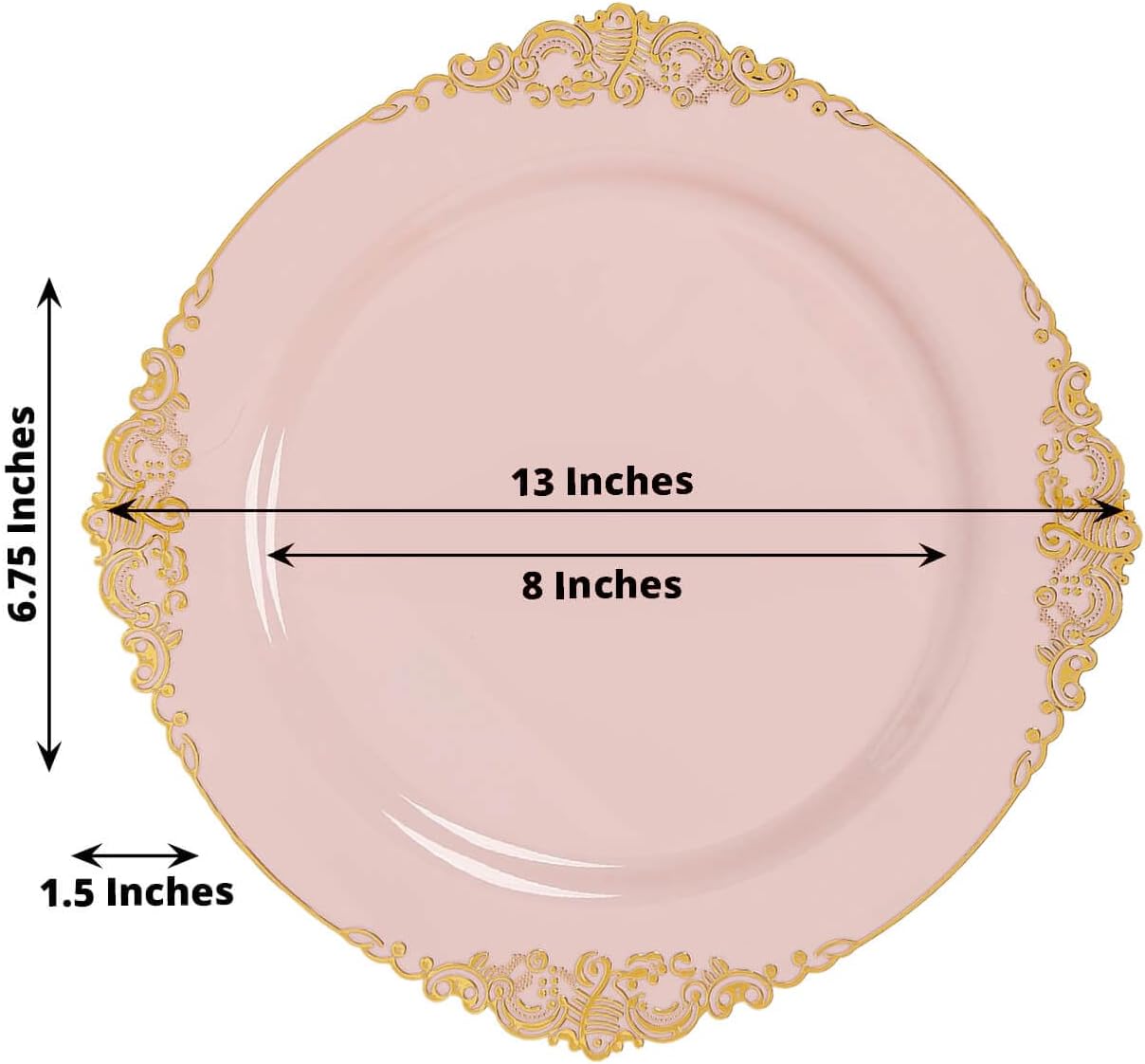 20-Pack Plastic Charger Plates 13" Round Ivory with Gold Embossed Baroque Rim These Plastic Charger Plates with a 13" round shape and gold embossed baroque rim offer an elegant touch to your dining events. Made from durable, high-quality plastic, these charger plates are perfect for serving meals at upscale dinner parties, weddings, or special occasions. The intricate gold embossed baroque rim adds a regal and timeless look to each plate, creating a sophisticated presentation for your meals. Whether you're hosting a formal dinner or a casual celebration, these charger plates elevate the decor and give a polished look to your table setting. Durable, Food-Grade, and BPA-Free Crafted from high-quality, food-grade plastic, these charger plates are sturdy and durable enough to withstand frequent use without bending or cracking. They are also BPA-free and non-toxic, ensuring that they are safe for both your guests and the environment. These disposable plates are designed for easy cleanup, making them both a practical and elegant option for any gathering. At 13" in diameter, these charger plates are the perfect size to complement your dinner plates and serve as a decorative base for appetizers or entrees. Their round shape fits most standard table settings and allows ample space for creating a stunning presentation. Stylish and Easy to Maintain With their disposable nature, these plastic charger plates make cleanup quick and easy after your event. There is no need for washing or storing large, heavy dinnerware. Simply use and dispose of them, saving you time and energy while still maintaining a beautiful, sophisticated look for your table. These economy plastic charger plates offer an affordable solution to achieving an elegant look at your event. These charger plates provide the luxury of fine dining without the expensive cost or the hassle of washing dishes, making them an excellent value for your next event.