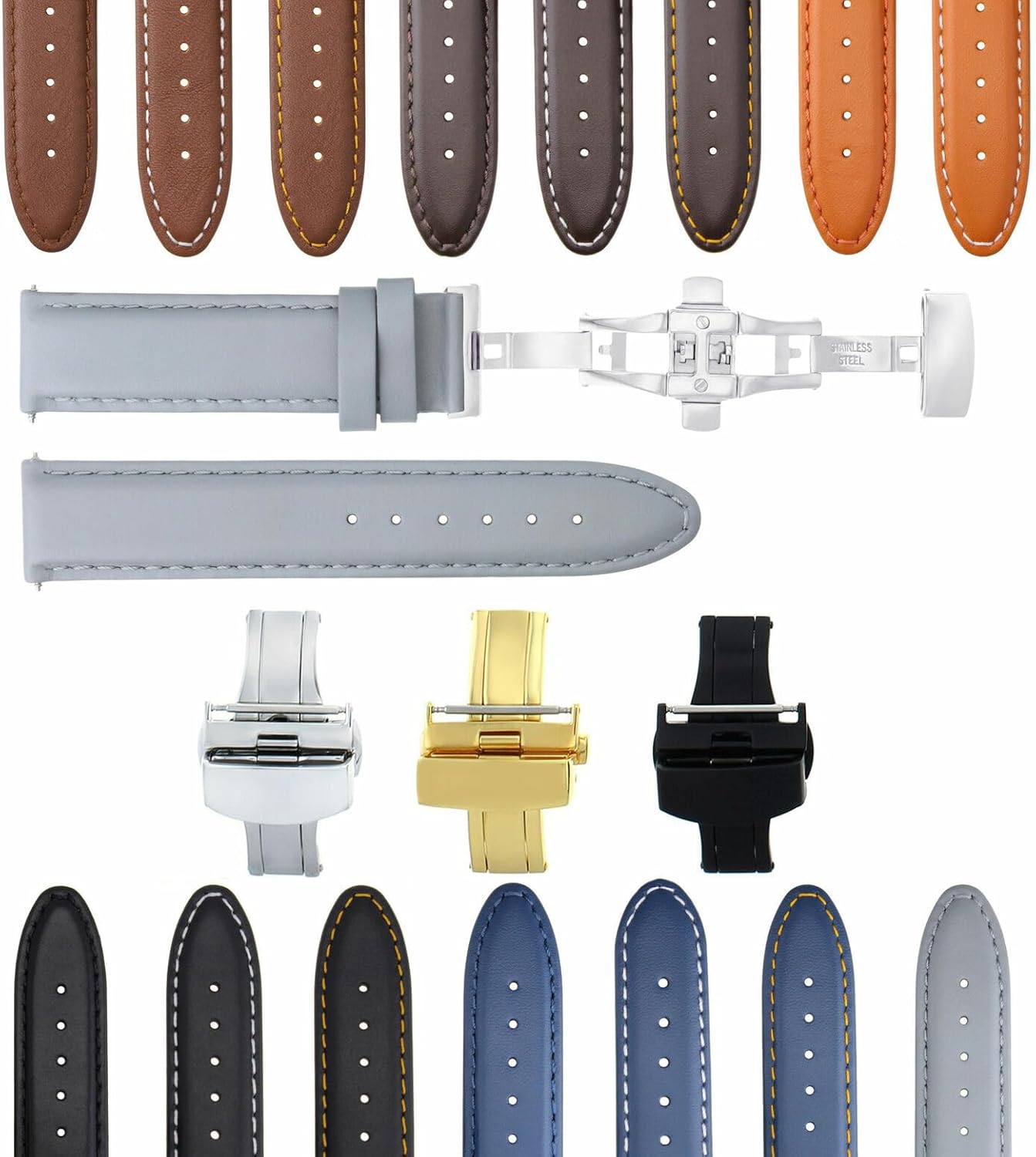 The item for sale is a brand new strap made of calf Real Leather and comes with deployment clasp.The strap comes with detailed thread stitching and thick 4.5mm padding with Real Leather lining on the back for comfort and a classy look. It will make the watch look very expensive with this leather strap.It will fit wrists up to 8 to 8 1/2 inches.Buckle is interchangeable and made of 316L stainless steel.Montblanc Watches With Lug Widths 18mm, 19mm, 20mm, 22mm, 24mmLength:Long Part: 115mmShort Part: 75mmFit Lug Width:18mm19mm20mm22mm24mmBuckle Colors Available:SilverGoldBlackAvailable Strap Colors:BlackBlueGreyLight BrownDark BrownOrangePackage Includes:1 Set (2 Pieces) Complete Leather Straps1 Deployment Buckle2 Spring bars includedEnsure the strap matches your watch model and lug width before purchase.