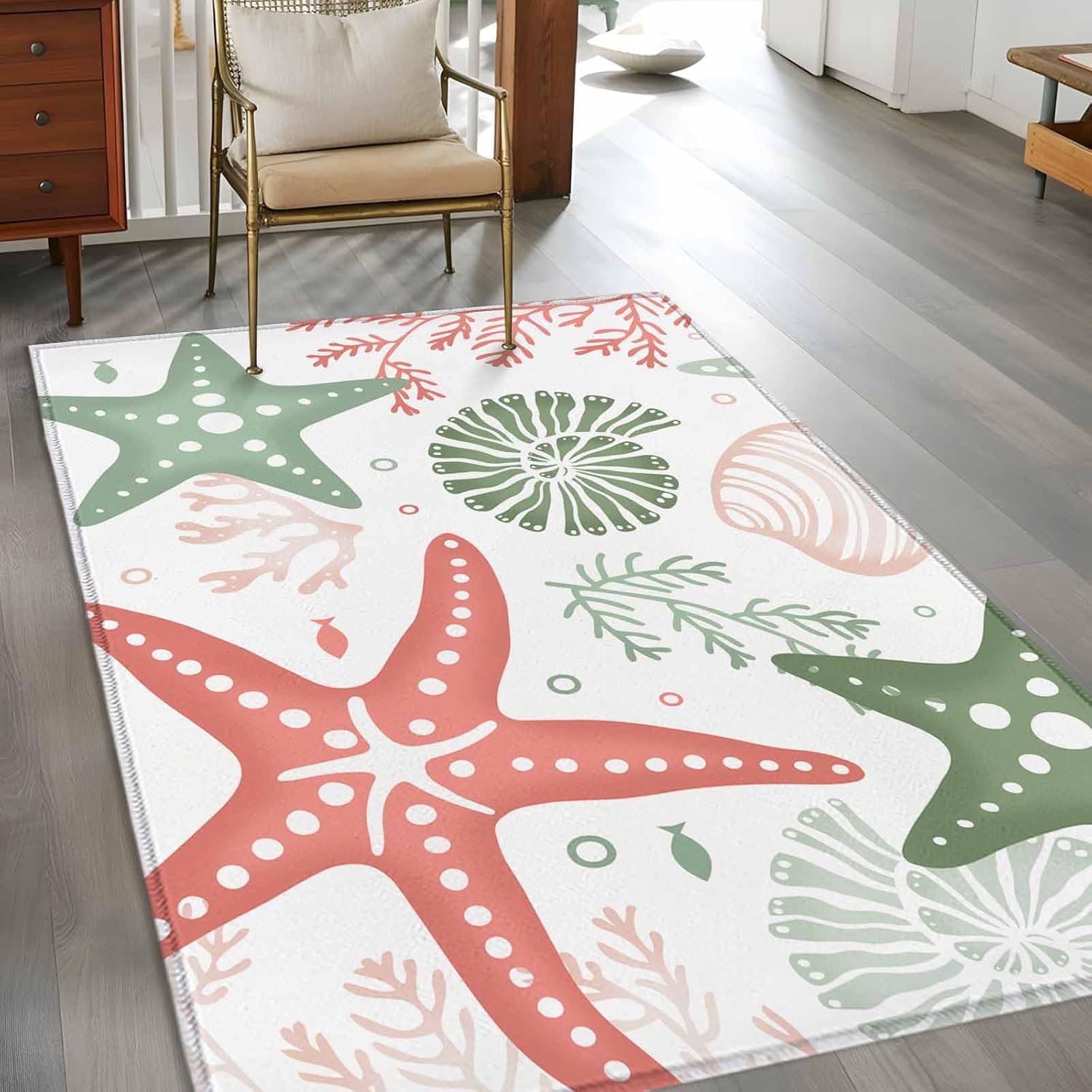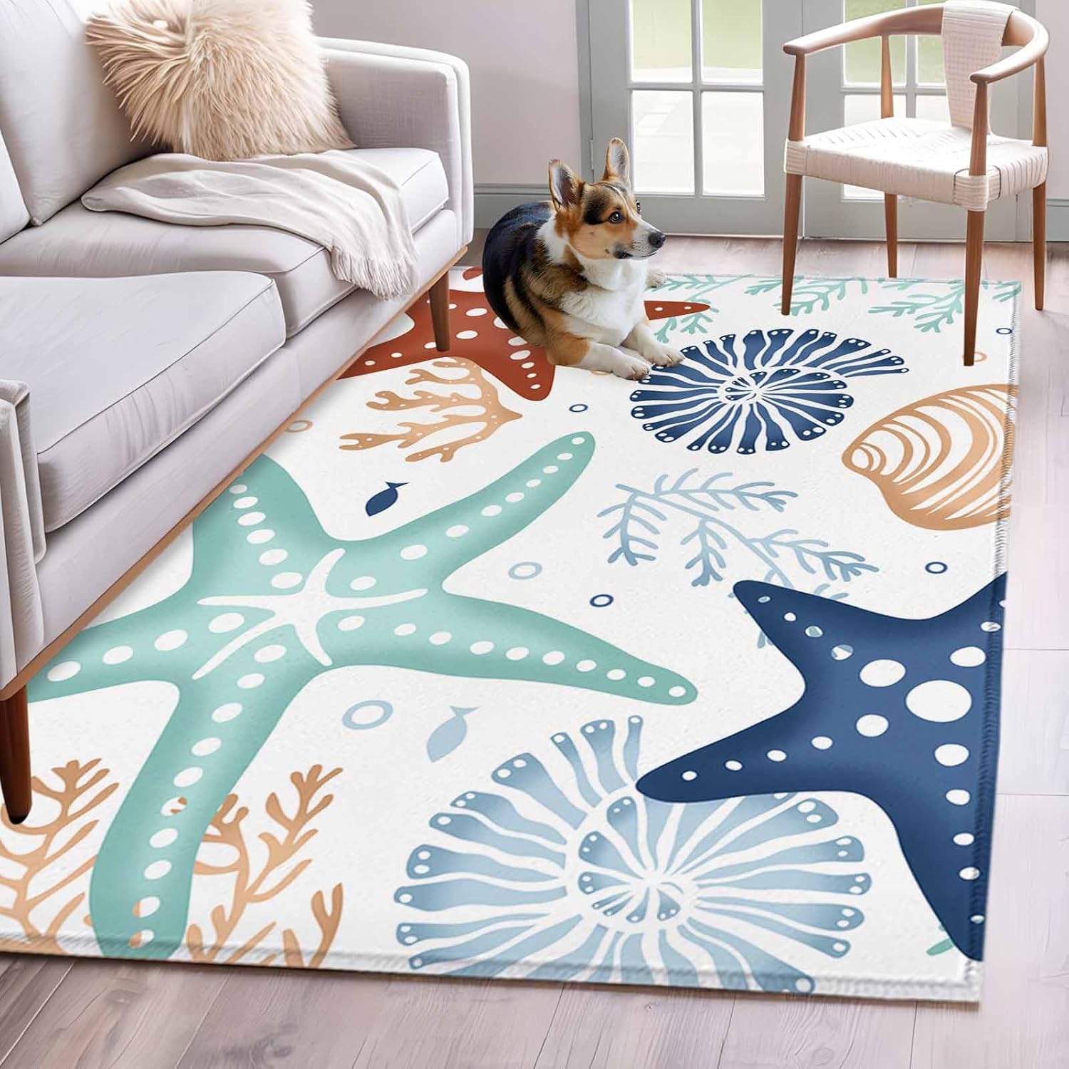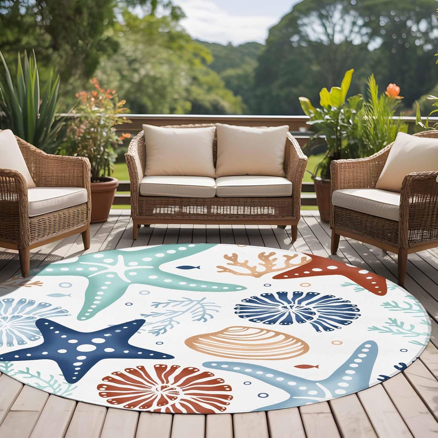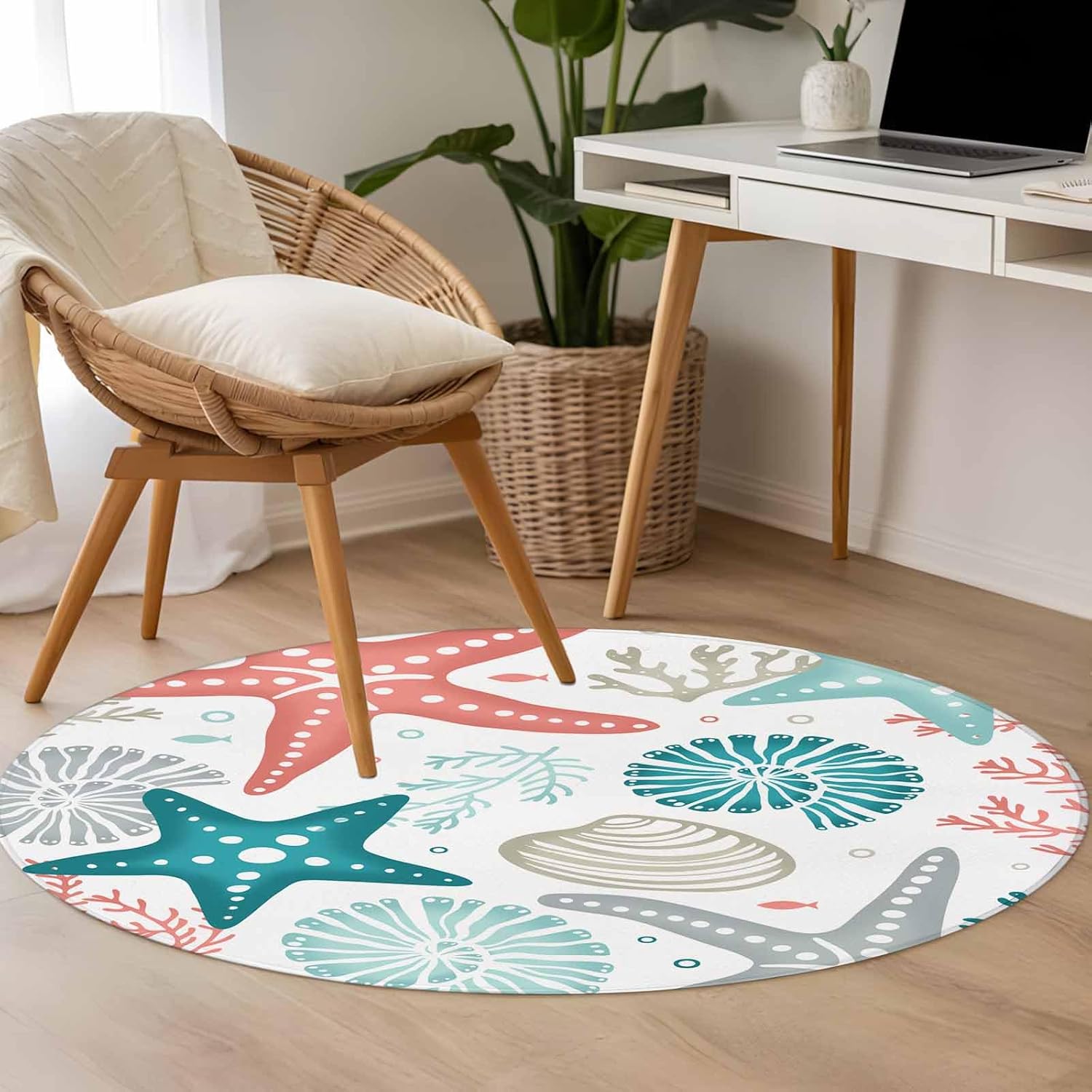 Large Area Rugs for Bedroom Living Room, Teal Green Coral Non Slip Carpet Bedside Rug, Spring Summer Coastal Starfish Beach Nautical Conch Round Floor Cover Kitchen Accent Rug 6' for Dining Room
