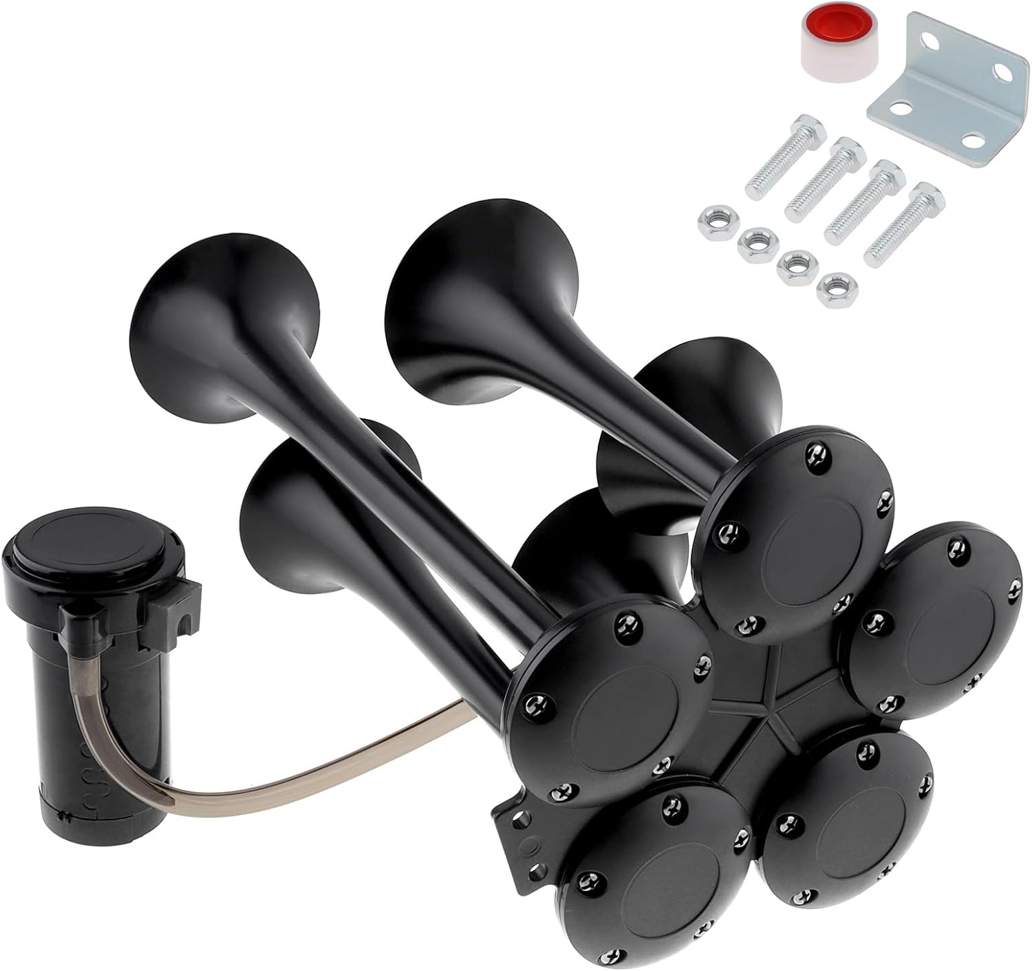 Features: - Our train truck horn kit consists of galvanized chrome material to ensure maximum strength and durability. - These horns for trucks and trains can be as loud as 185 decibels. With such a strong sound, this is the most effective and safest way to alert others to your presence. - This train horn is easy to install and includes all mounting hardware. It is flexible and portable, so you can easily remove it from one car to another. - The 5 horn train horn kit is compact enough to fit most vehicles such as cars, boats, trucks, tractors, motorcycles, etc. It is very suitable for large vehicles in heavy traffic or emergency situations. - It can withstand harsh weather conditions or extreme temperatures with reliable and longevity. Specifications: Sound Level: 185db Material: Zinc Alloy + Chrome Type: Multi-tone & Claxon Horns Voltage: 12V Fundamental Frequency: 530/680 Hz +/- 5%. Sound Pressure Level at 2m: >= 115 dB(A). Sound Pressure Level at 4in: >=185 dB(A). Reliability: 100.000 on/off cycle. Place of Application: - Large trucks, scooters, most motorcycles/mopeds, all-terrain vehicles, karts, off-road bikes and motorcycles. Installation Note: - Solenoid valve air pipe joint should be carefully tightened, sometimes blocked by the filter net in use, and should be always cleaned so as not to affect sound . - No Installation Instructions Included, professional installation is recommend. - Each installation is custom depending on the application. - Connected directly to the battery relay. - If you have not connected the horn relay, may cause electrical problem. - It is recommended to use 20A-30A fuse. - Mounting angle downward,so that moisture can not collect in the horn. - If no sound or strange sound,check the horn wire (+/-). - Connect the grounding cable to avoid spark. - Disconnect the ground cable first remove. - Be careful not to put too close to the chassis of the horn trumpet rattling noise reduction. Package Includes: 5 x Trumpet Air Horns 1 x Compressor 1 x Air Tubing 1 x Mounting Hardware 1 x Relay Wiring Harness Kit